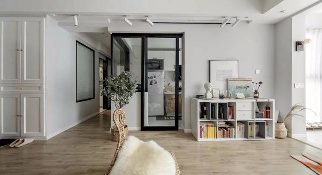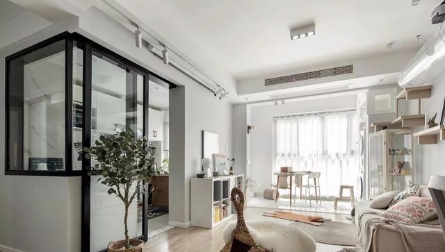 客厅与阳台打通,与厨房之间以玻璃门相隔,不大的空间,采光和通透性却格外的好。