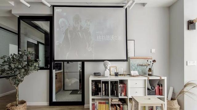 打开投影后,坐在沙发上,便是另一番场景。不以电视为中心的客厅,可以是书吧,也可以是影音室,功能更多样。