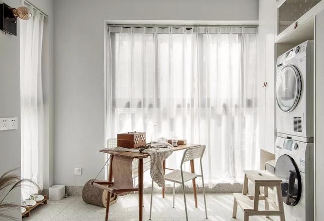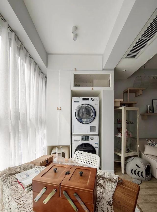 洗衣机、烘干机嵌入到收纳柜之中,看上去更整洁,而且增加了房间的收纳功能。