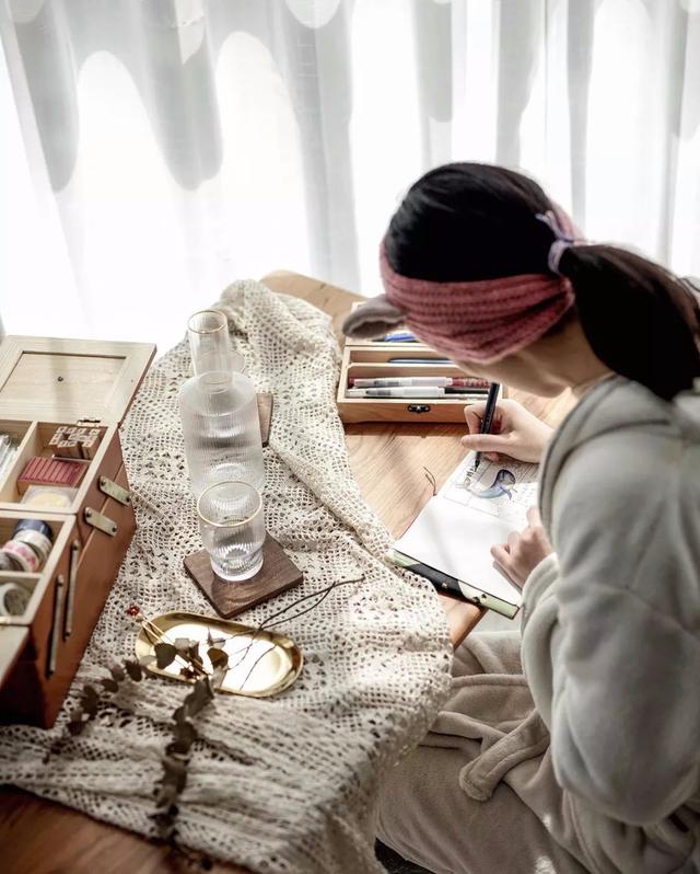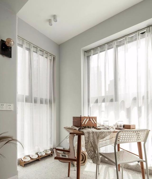 阳台水磨石的地面不仅耐脏而且质朴的感觉也很符合生活的调性。餐桌不仅是用餐区,也是两个女孩的手工、创作操作台。