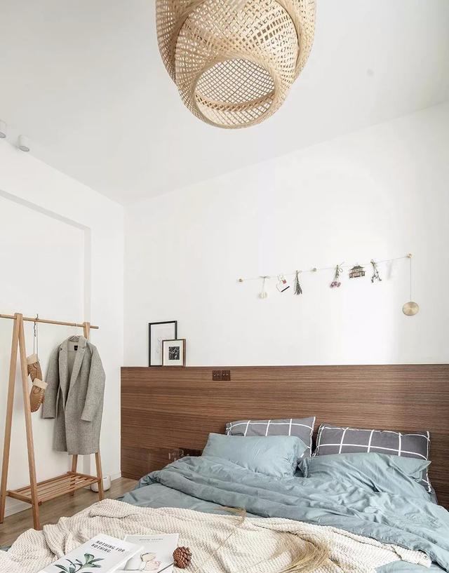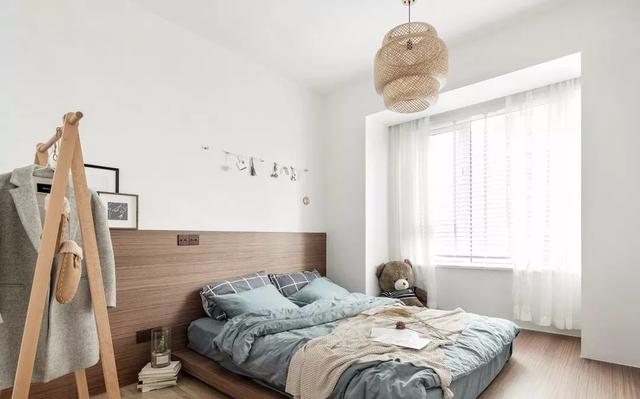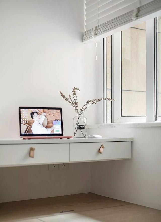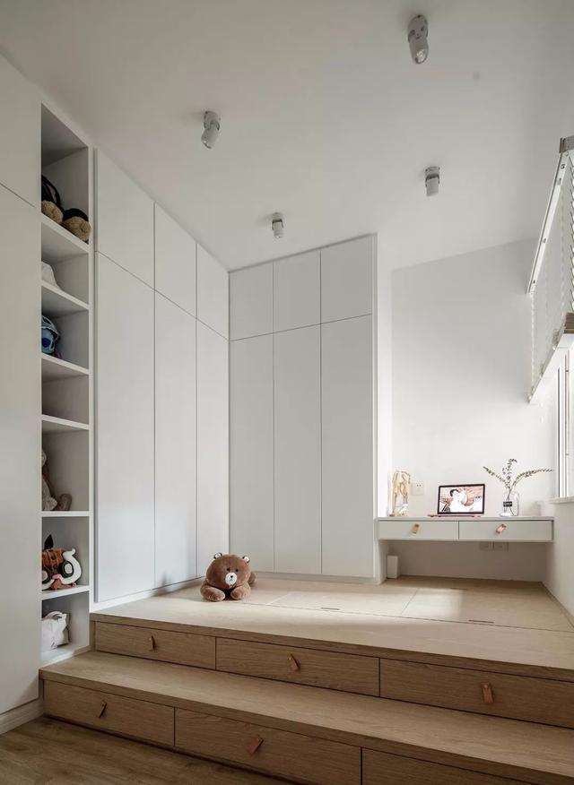 次卧榻榻米地台+转角衣柜+书桌一体设计,充满的收纳是主卧室储物功能的补充,墙面用白色减少闭塞感,地面用原木色呼应整体调性。