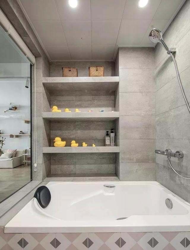 作为刚需的小浴缸,侧面我们利用包柱与墙体间的凹槽,制作了与墙面一致材质的大壁龛,经久耐用的同时也可以容纳卫生间的超多储物空间。