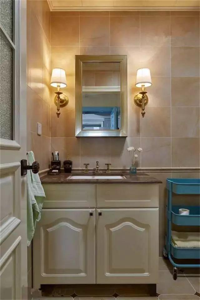 整个卫浴间也是美式风格为主,复古风格为辅,洗手台右侧的储物小推车,既实用又美观。