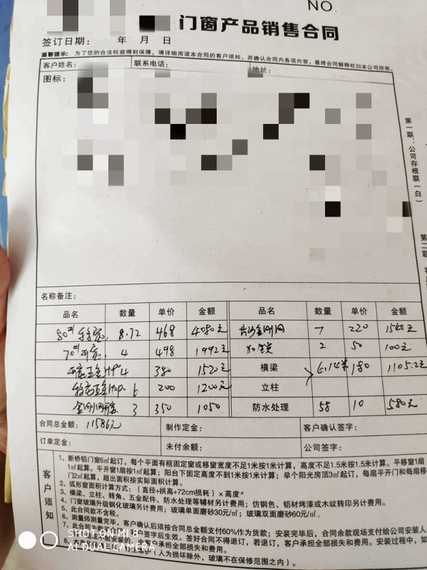 原以为几千块钱可以搞定的封阳台,没想到最后签订正式的销售合同时,所有的总价加起来居然要11586元!这让他非常不能接受!