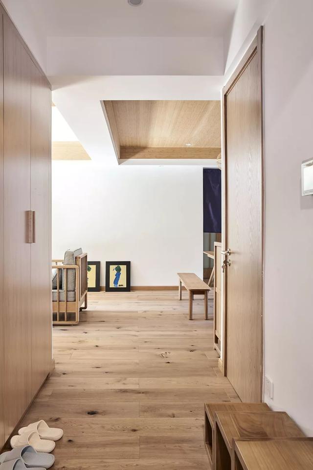 入户的玄关走廊一侧做了嵌入式鞋柜,另一侧是高低不一的换鞋凳,方便屋主一家人坐着换鞋,平时拖鞋也能藏在换鞋凳的底部。