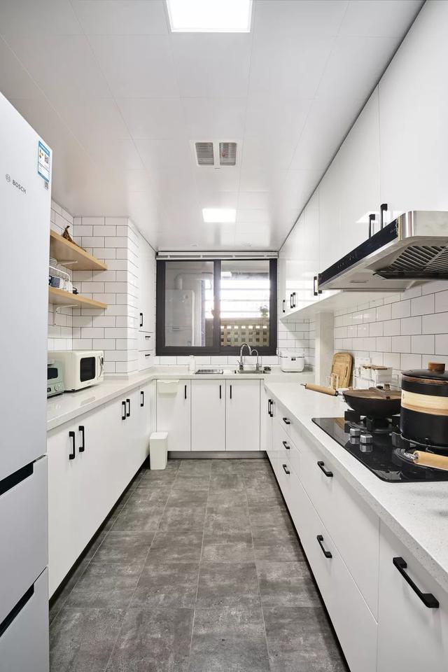 厨房内部的空间还是比较宽敞的,设计师选择了U字形的橱柜布局方案,让厨房动线变得更短,储物空间又更多,再加上白色与灰色的结合,简约而又轻松。