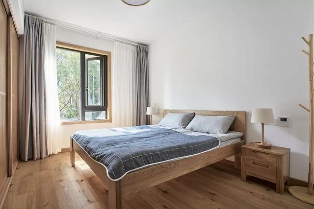主卧室的设计非常的素雅,大白墙搭配灰色的床品、窗帘和木质家具,床尾处做上嵌入式的推拉门衣柜,床头柜边上摆放衣帽架吗,简约自然当中又不失清新文艺的感觉。