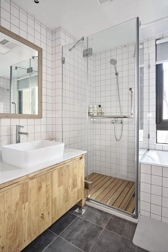 公卫的空间是非常宽敞的,除了淋浴区外还有着一个大浴缸,马桶和洗手台也分列在卫生间的两侧,整体白、灰与木的搭配显得年轻大方。