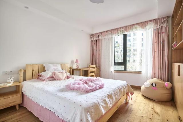 儿童房在白与木作为主体的情况下,加入了粉色作为点缀,搭配一些卡通元素,让儿童房变得更为浪漫、可爱一些。