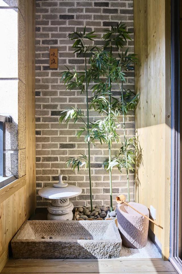 阳台的一侧被设计师利用起来做成了一个山水小景,另一侧就是洗衣区。阳台上铺设防腐木和文化砖,也让人感觉更为自然文艺。