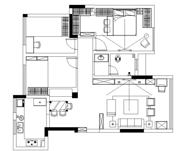 厨房和餐厅之间做了半墙隔断,那么自然也是半开放式的布局。厨房内部蓝白色的小砖相间,让人感觉到一些小清新感。