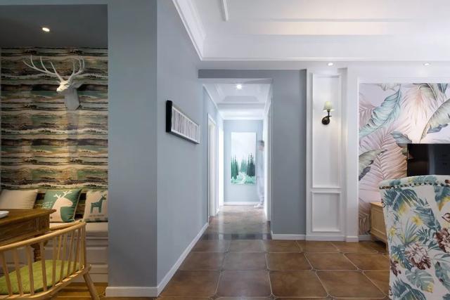 入户玄关位于中间的户型,一直延伸到了卧室的走廊,尽头处的绿植装饰画和灰蓝色的背景墙、深色的仿古砖结合起来,有些别样的差异感。