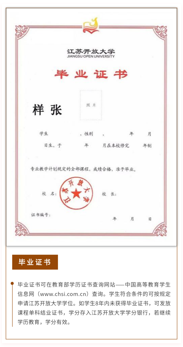 ●学生在学籍期内取得规定学分准予毕业,颁发江苏开放大学毕业证书。