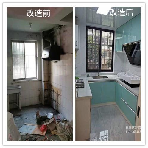 改造前的厨房已经发黄了,墙面上也都是油污,地面都黑了。改造后的厨房干净清爽,U型设计,增加收纳能力,湖蓝色橱柜,清新自然。
