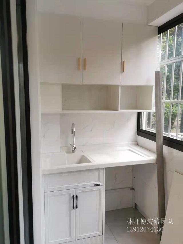 阳台也是非常清爽,一体台面方便打扫,上下柜子方便储物。