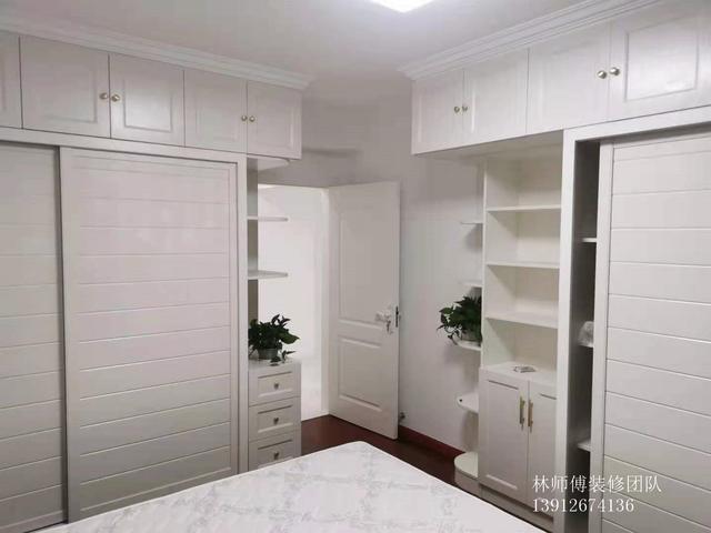 主卧,业主不怎么看电视,所以房间没有电视机,取而代之的是做了橱柜。两面墙都做了到顶的橱柜,衣服、被褥再多都不怕没地方放。而且柜子的边上都留了一部分做成了开放式的格子,方便拿放平时常用的物品。