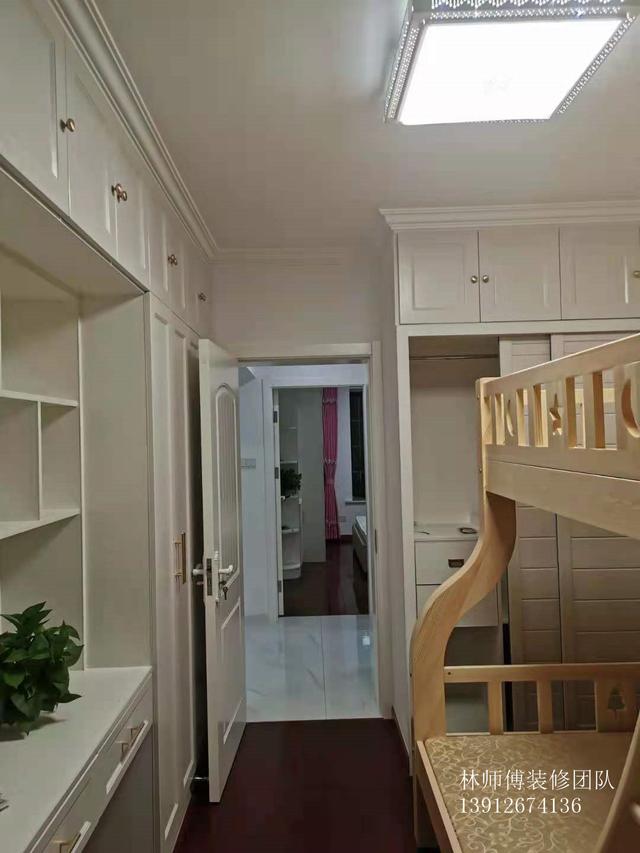 次卧是孩子的房间,所以也没有安装电视机,和主卧一样,做了两面的橱柜方便储物。不同的是,电视墙这边设计了一个书桌,方便孩子平时学习。书桌上面是开放式书架,方便拿取图书。业主有两个孩子,在只有一个次卧的情况下,上下床可以很好的解决这个问题。