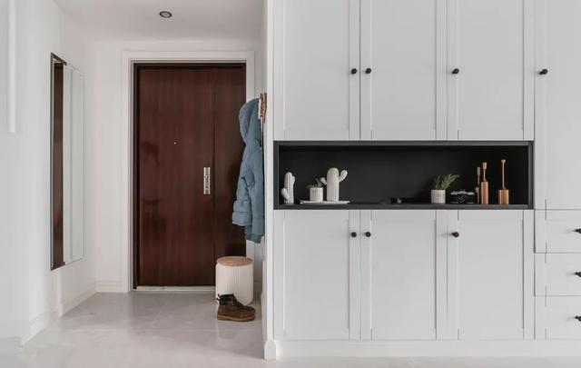 这样中间和柜底悬空的设计,中间放绿植、相框、钥匙、零钱的,底部放常穿的鞋子,其他封闭起来的柜子都可以当做收纳柜。