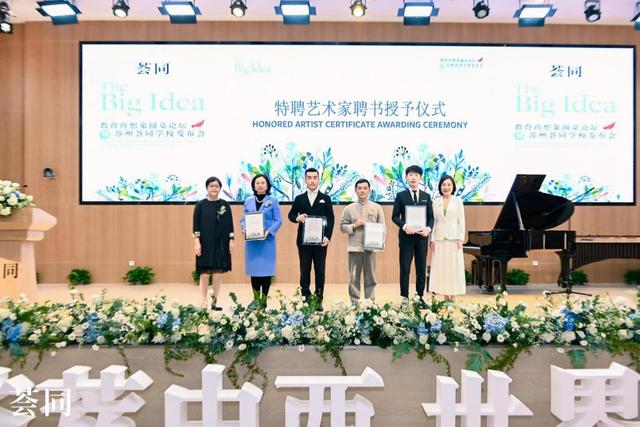 现场,苏州荟同学校为国际著名雕塑家蔡志松先生,中国当代摄影师和视觉艺术家陈漫女士,中国工艺艺术大师蒋喜先生,全球施坦威钢琴演奏家刘骥先生,著名歌手孙楠先生,以及特聘学术顾问,原哈佛校友总会亚太区主任孙玉红女士颁发特聘证书。这些来自艺术及学术领域的重量级人物将成为荟同学子们的导师,也是他们求学道路上绝佳的榜样。刘骥先生更特别为苏州荟同学校创作的《戏曲变形计·苏州印象》钢琴曲目,精彩的演奏让在场观众赞叹连连。