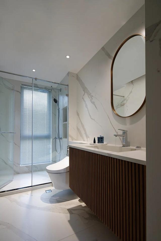 1、如果想清洁更轻松,洗手盆选择台下盆,安装壁挂式马桶和悬挂式浴室柜,浴缸装嵌入式的,干湿分离不要做玻璃隔断,可以用隐形浴帘。