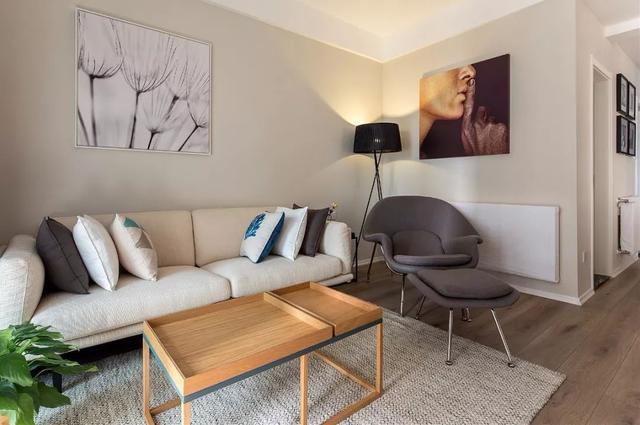 将木色和白色作为主打色,其他的家居配饰,则与整体格调和谐统一。画作平衡了浅灰色沙发的色彩,大小不一的茶几拼接在一起更加充满趣味性,显得格外的轻松、大方。