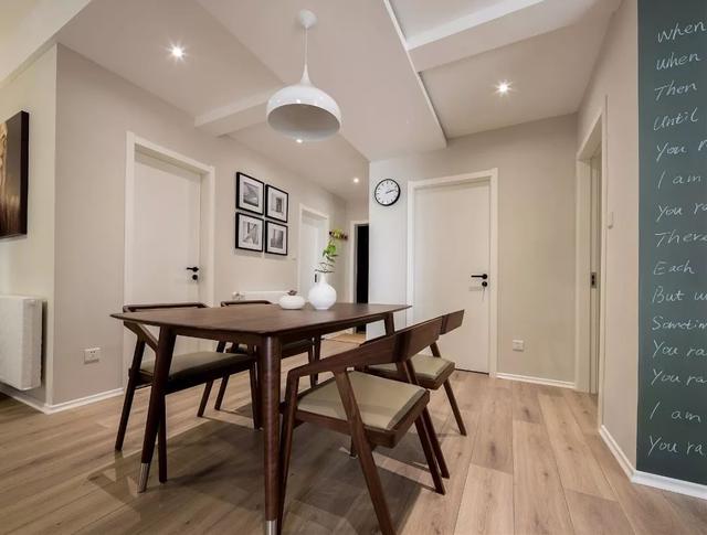 采用原木材质的餐桌,配合白色墙体,空间营造出来最质朴的温馨感。深色的色彩使空间更加的稳重而有韵味,干净利落。