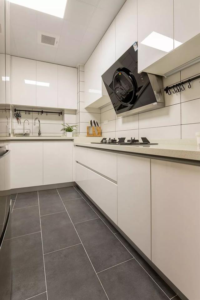跨入厨房,黑白灰搭配,配上隐藏的拉手,满足厨房的收纳需求
