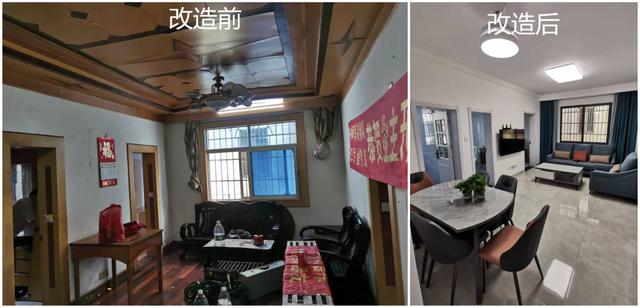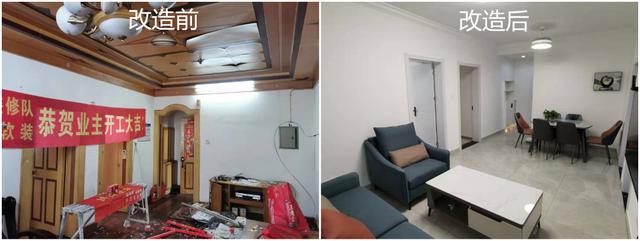 改造前的客餐厅,复杂的吊顶让原本层高就不高的空间看上去非常压抑,老式的土黄色装修也非常的难看。改造后吊顶换成了简约的石膏线,压抑感瞬间被缓解了,而且还更美观了。玄关改造了内嵌式的,看上去更加整体统一,玄关处的门框也拆掉了,看起来更敞亮了。餐桌靠墙摆放,节省空间,能留出更多的活动空间。