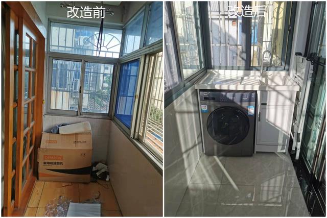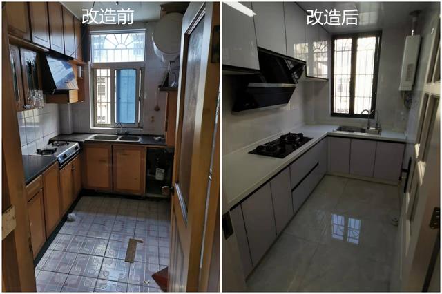 改造前的厨房使用年限很久了,瓷砖、台面等都发黄、霉变了。而改造后的厨房,非常干净清爽,白色的瓷砖搭配白色的橱柜台面,清清爽爽、整洁有序,在这样的环境下做饭,心情都会非常好呢。