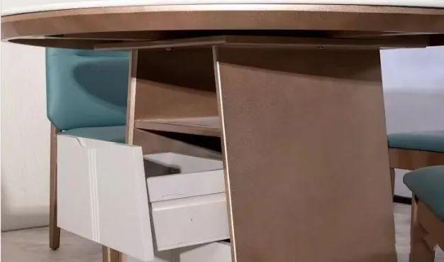 抽屉储物圆餐桌。注重收纳功能的家庭可以选择抽屉储物设计,采用全实木承重底座,抽屉设计增加储物空间,可以收纳日常小物件。