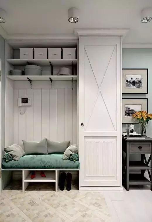 2、玄关墙壁不要空着,最好安装通顶的收纳柜,便于摆放鞋子,同时下方可以不要触地,留出可以直接放进鞋子的空间。