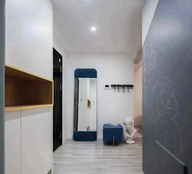 入户门厅空间还挺宽敞,设计上一边靠墙设全身镜、换鞋凳、挂钩等日常最基本的东西。靠厨房一边设了鞋柜。过道还有一面黑板墙设计,随意涂画,很有趣味性。