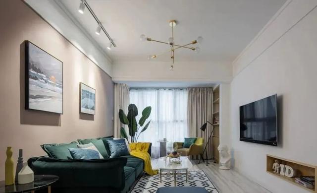 客厅色彩还挺丰富,有暖色沙发墙、有墨绿色沙发、还有白色电视墙,不同色彩的结合,让空间氛围更活跃。