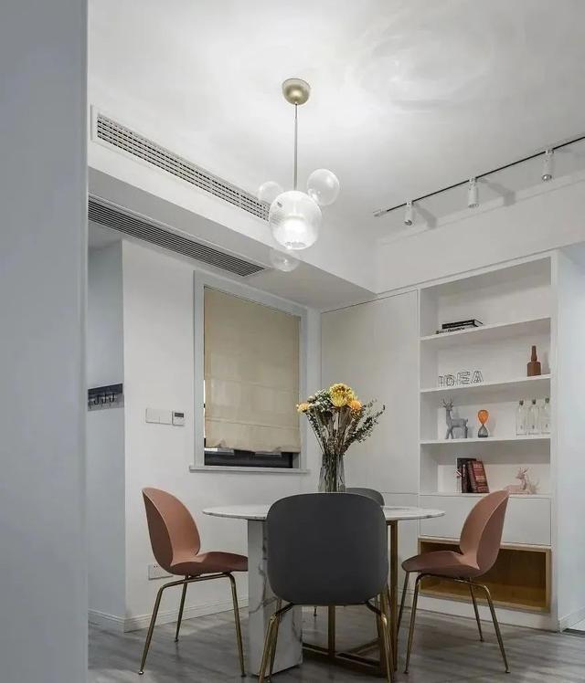 大理石餐桌,挺上档次。轻巧的餐椅,还有时尚的吊灯,让餐厅更具情调。