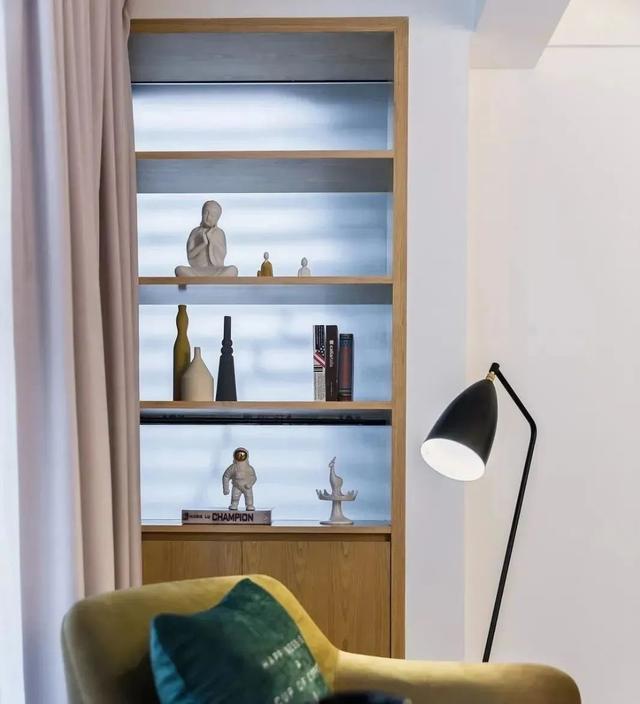 阳台设有展示架,摆设工艺品、书籍等,好看有品位。座椅、边桌、落地灯,搭建一个休闲读书角,很惬意。