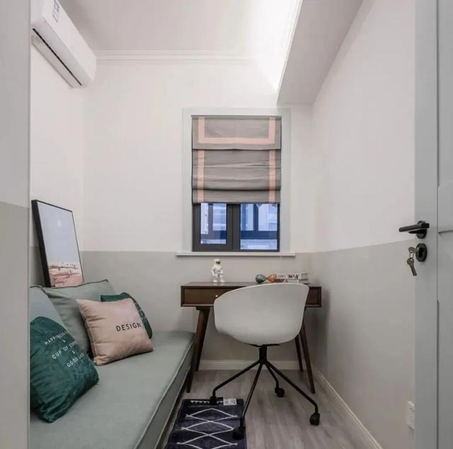 书房空间小,一张沙发,一个书桌搞定,布置得简单大方,舒适实用。
