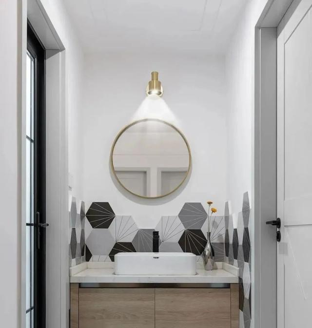 洗手台外移,干湿分离更彻底,早起洗漱、如厕互不影响,家人使用更方便。墙壁上六边砖、圆镜、壁灯都好精致。