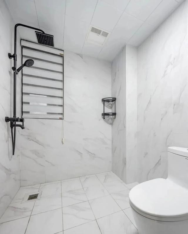 卫生间里面,整个白色瓷砖显得干净又明亮。空间不大,没有装玻璃隔断,或浴帘,这样更省地方,不压抑。