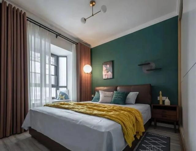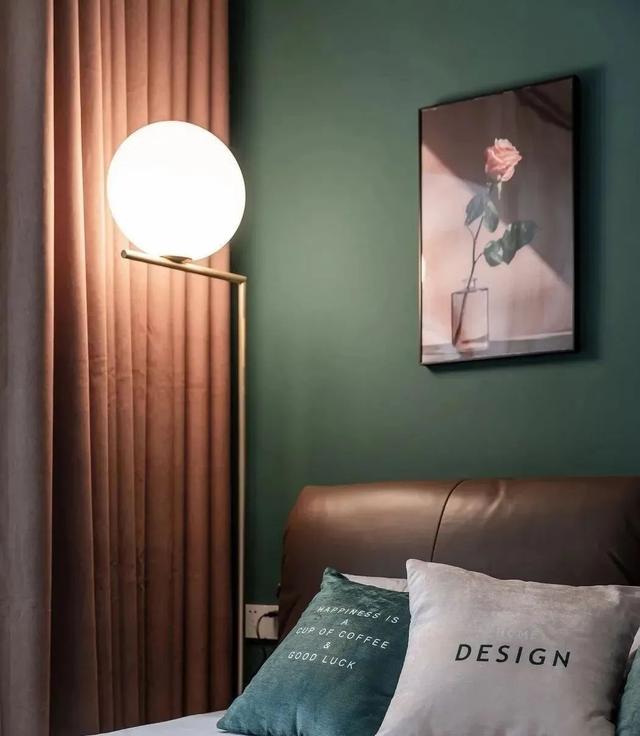 主卧,整个色调搭配十分个性,墨绿色背景墙,棕色窗帘、家具等,沉稳的色彩更具复古气质。