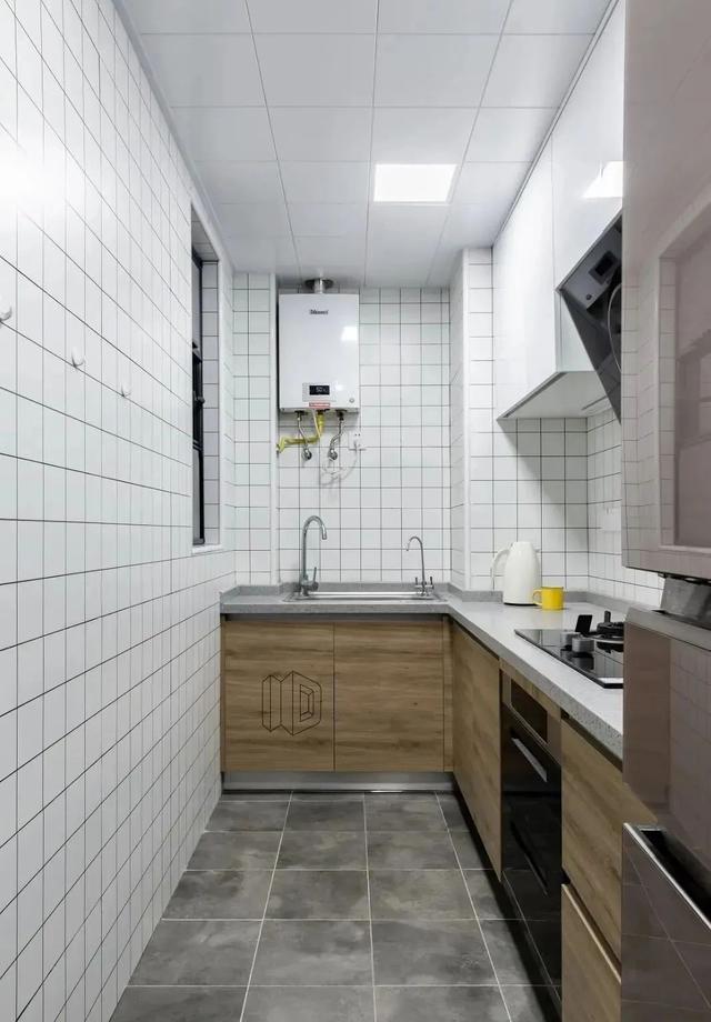 白色墙砖,很是干净明亮,原木色橱柜,增添自然舒适感,厨房呈现简约、时尚的效果。