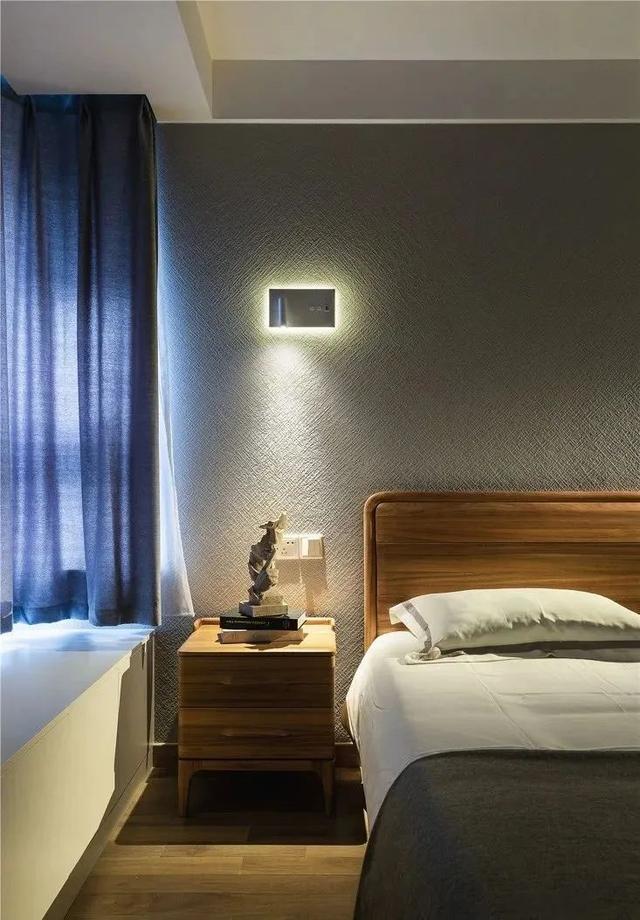 ▲主卧温和宁静散发出随性文艺的气息,低饱和度避免色彩碰撞让整体更为柔和。对称的壁灯配合灯光的氛围烘托,点亮了单调的背景,再添一份温馨。