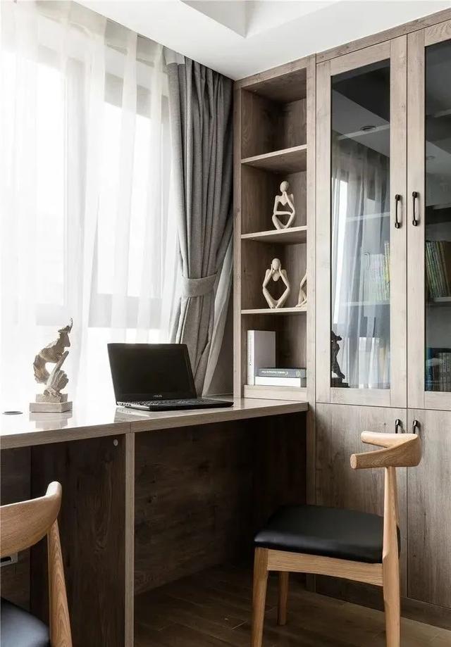 ▲ 饱含自然韵味的原木定制书桌及书柜,让整个书房具有了安静质朴的味道。