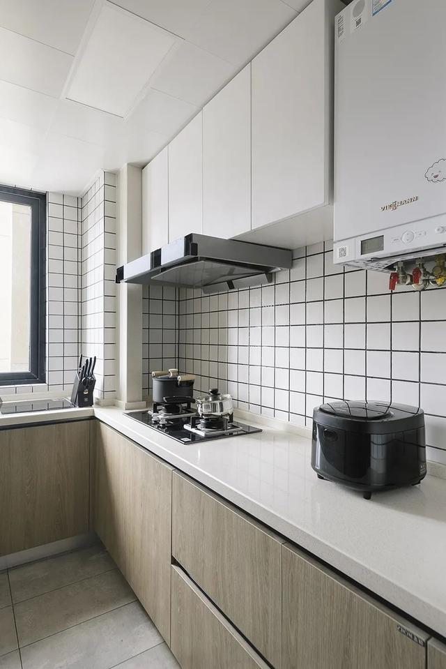 从灰色地砖、橡木色柜门过渡到白色台面,拉伸了空间层次感,使狭小的厨房显得更为开阔。