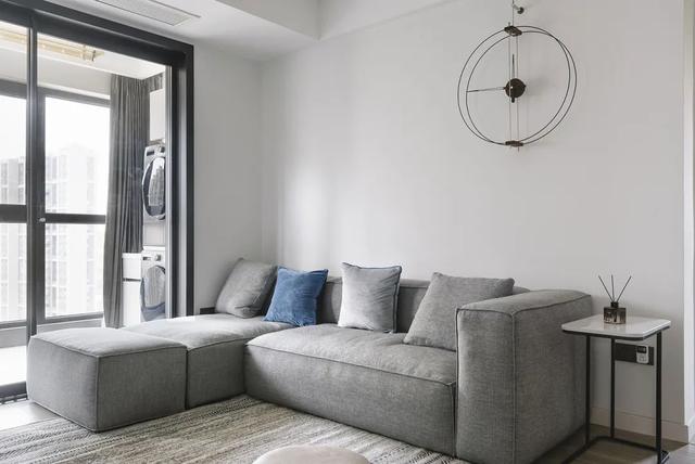 整个空间的储物柜门都是隐形般的存在,电视墙用黑色边框勾勒出简洁且大气的造型。