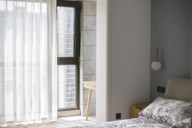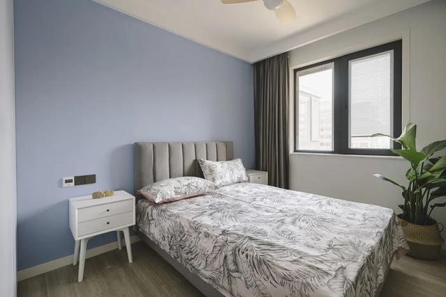 次卧空间更从容,背景墙选用比较明亮的灰蓝,与整体风格呼应。一株长势极好的鹤望兰,翠绿的生机,偶尔让眼睛得到舒缓