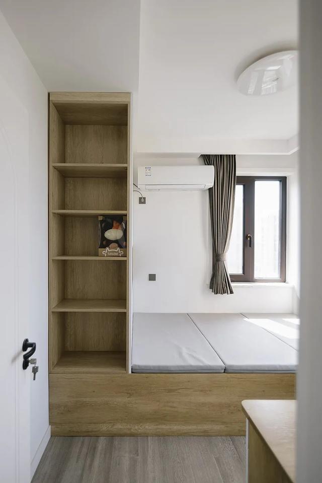 书房靠窗做了榻榻米,增加储物功能,必要时也可以当作客房。床尾补充一组开放收纳格,作为书架展示区,或者放置自己喜欢的摆件。