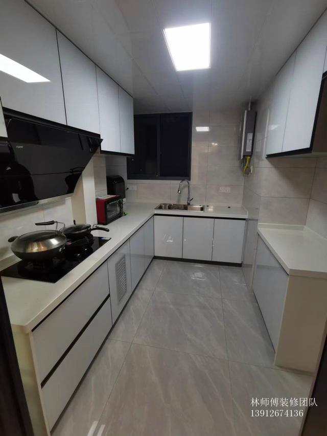 厨房是U型设计的,储物能力充足。白色的橱柜让厨房看起来更加干净清爽。