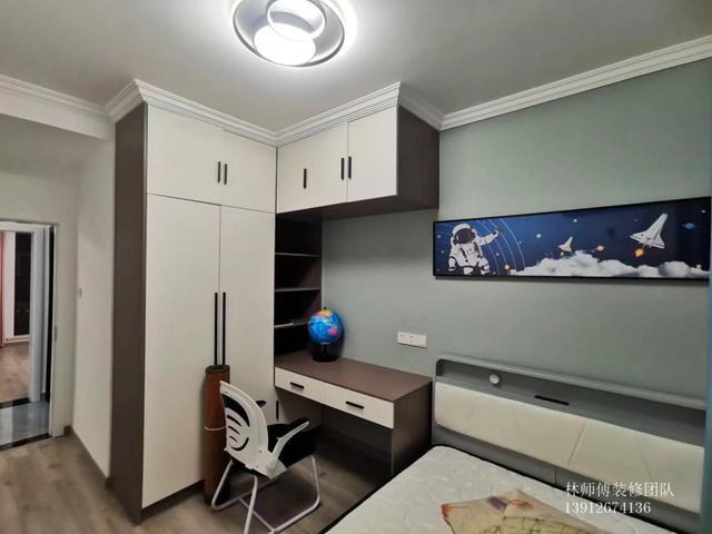 次卧是儿童房,蓝色的背景非常清新,挂画也是选择了很有童趣的宇航系列,更符合孩子的探索精神。衣柜做了转角的,延伸部分设计成书桌,方便孩子学习。