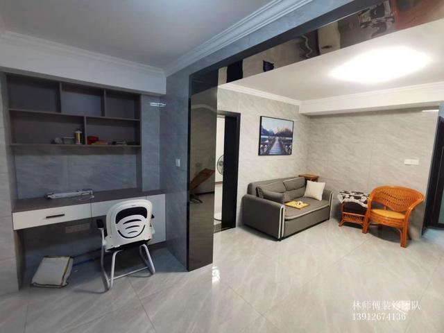 楼下是一室一厅,和上面一样,客厅和阳台是连通的,看上去更宽敞些,阳台处打造了一个办公区域,有时候工作带回家也不会没地方呆了。