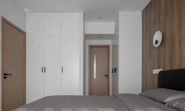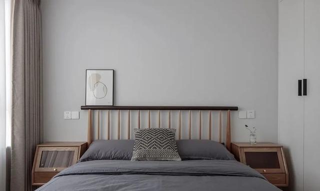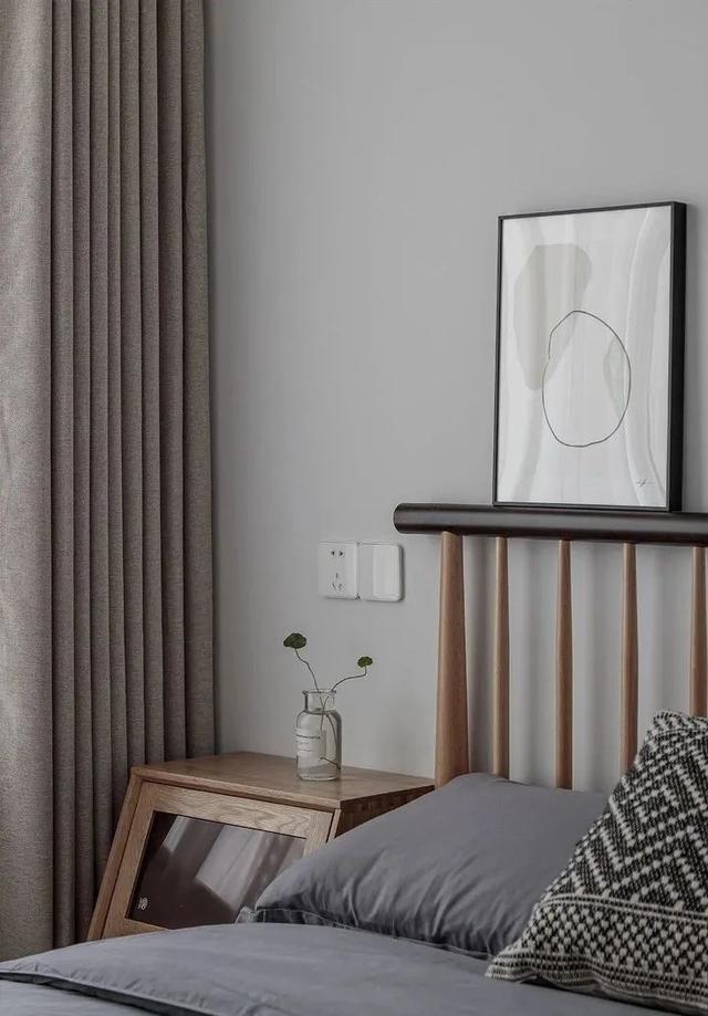 纹理不同深浅的原木材质、魅影黑的大床与丝绸般床品的交融,呈现出“不正宗”日式难能可贵。木地板背景墙,与地面颜色稍作区分,即达到立体层次的充分体现。